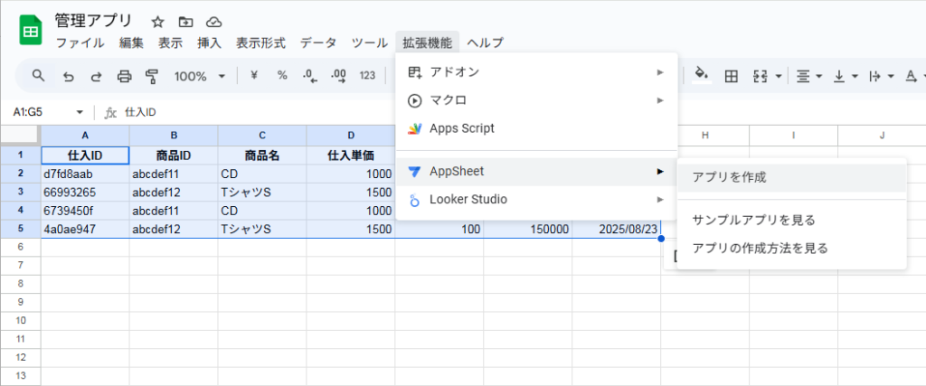 ここまでスプレッドシートで作成したら上の「拡張機能」から「AppSheet」の「アプリを作成」をクリックします。
