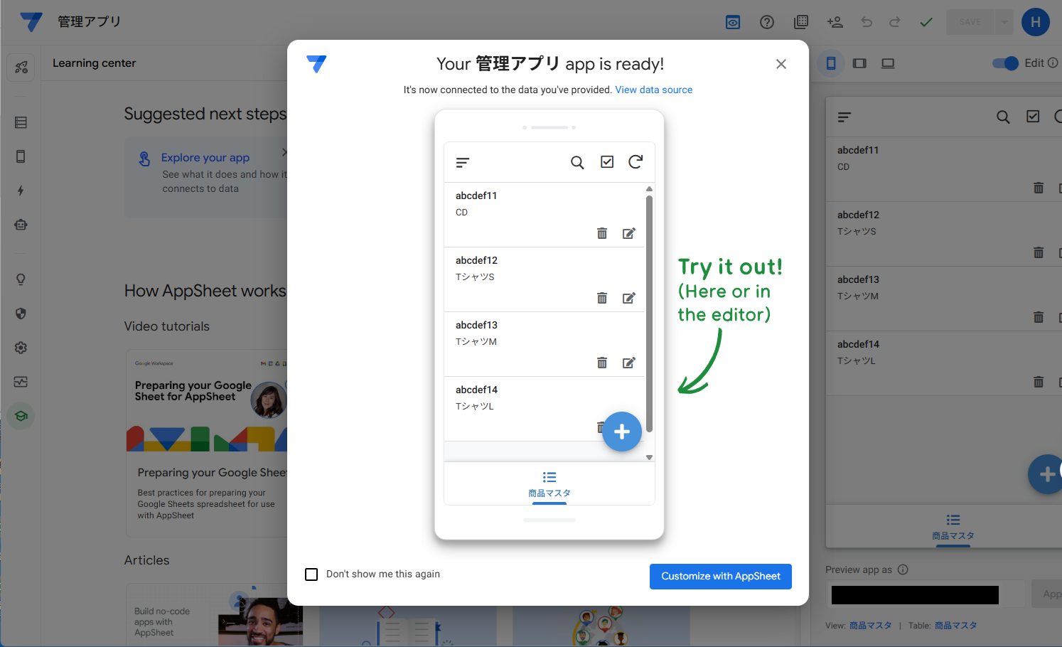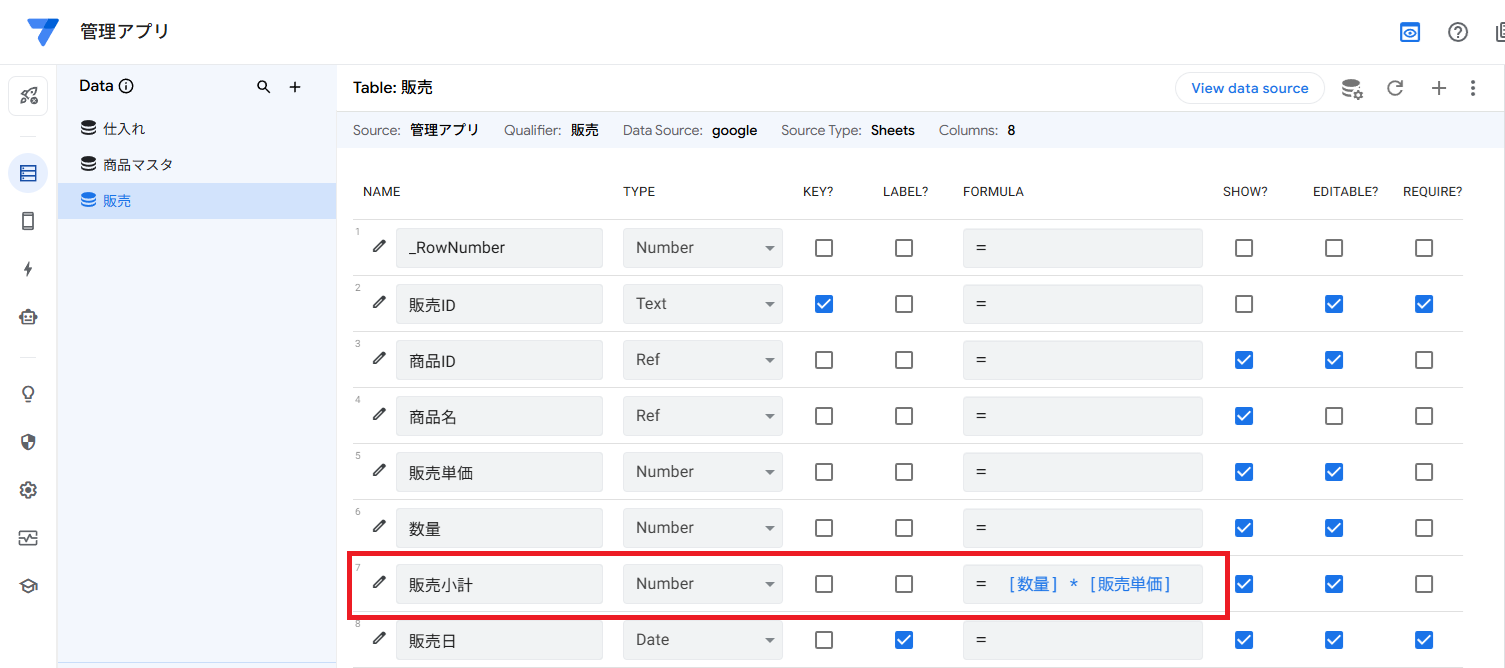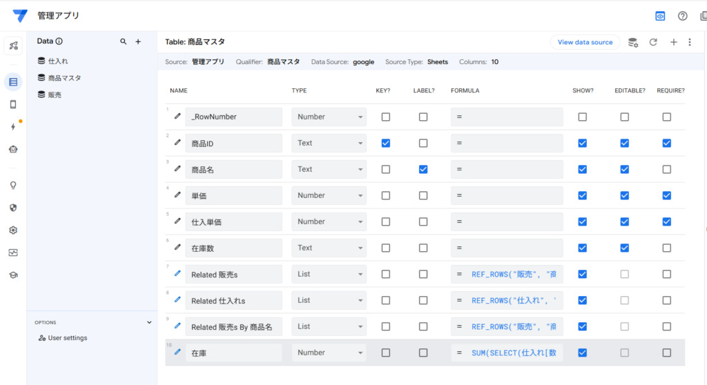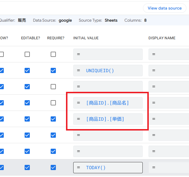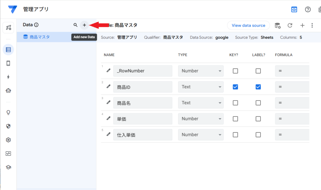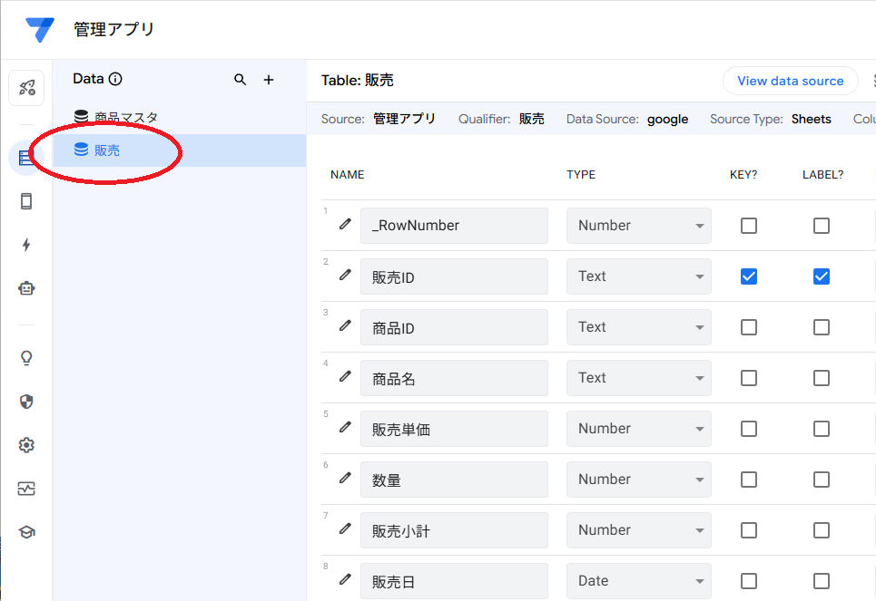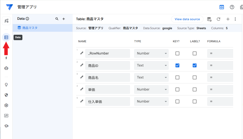 ここまで設定したら、View data sourceで商品マスタのシートを開きます。
