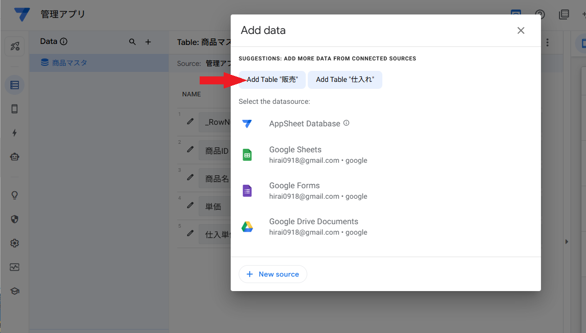 そうすると、データベースになってる状況が確認出来ますが「商品マスタ」だけしか表示してないので、「販売」と「仕入れ」もアプリに認識させる必要があります。