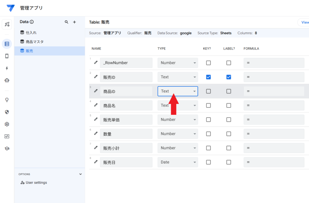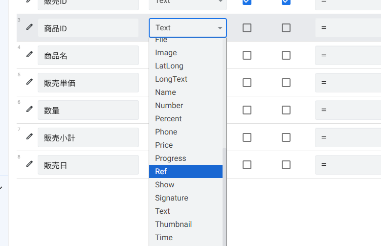 • 販売テーブル: 商品ID列のTypeを「Ref」にし、Source tableを「商品マスタ」に設定します。