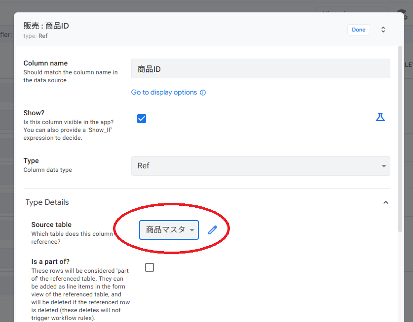 この設定により、販売仕入れの入力画面で商品IDを選択すると、AppSheetは商品マスタから関連する情報を取得できるようになります。