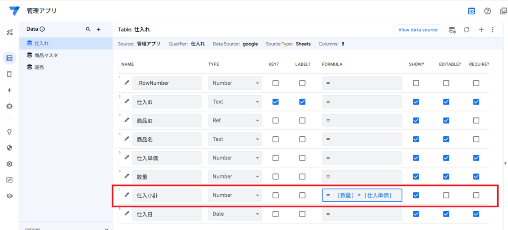 • 仕入小計列: Formula[数量] * [仕入単価]と記述します。同様にEditable?のチェックを外します。