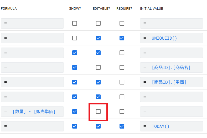 • Formula[数量] * [販売単価]と記述します。この列は、ユーザーが手動で入力するのではなく、自動で計算されるためEditable?のチェックを外しておくのが一般的です。