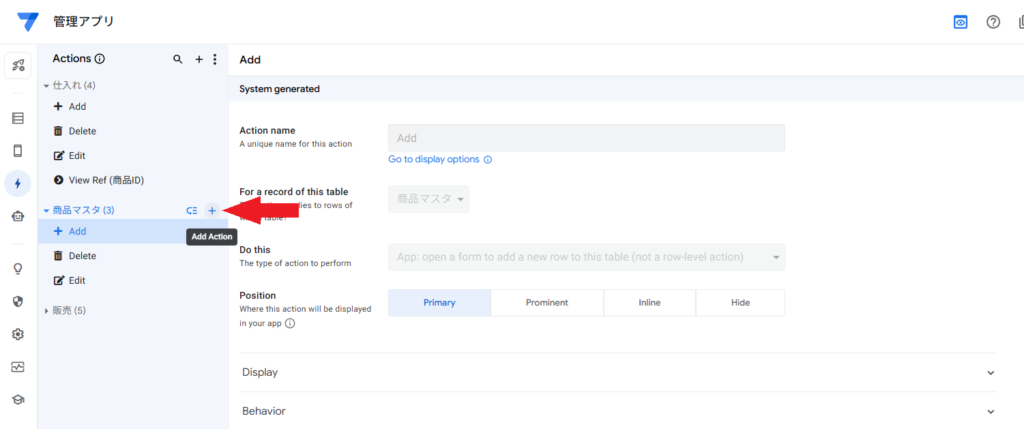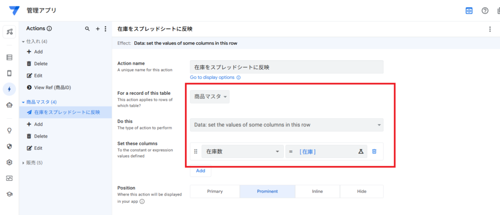 3. アクションの表示: 作成したアクションを、ビュー(例:商品マスタのデックビュー)に表示させます。ユーザーはボタンを押すだけで、リアルタイムな在庫数をスプレッドシートに書き込めます。