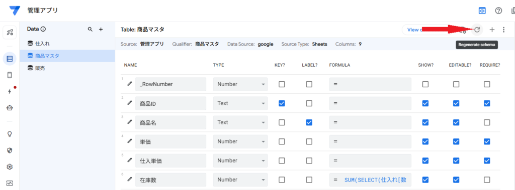 在庫数を作成したらAppsheetのDataの商品マスタの画面に戻りまして、Regenetate schemaで更新します。