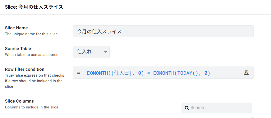 下のように名前は「今月の仕入スライス」、テーブルは「仕入れ」、Row filter conditionに「EOMONTH([仕入日], 0) = EOMONTH(TODAY(), 0)」を入力して保存。