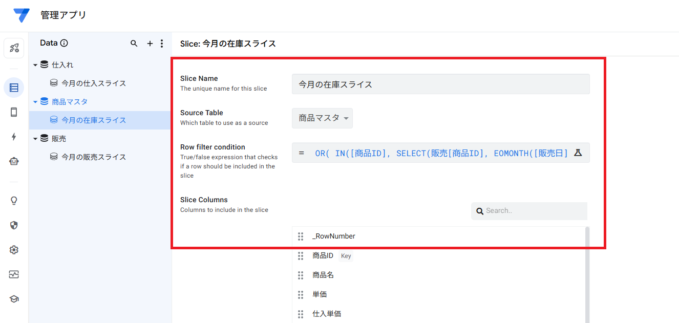 名前「今月の在庫スライス」、テーブル「商品マスタ」、Row filter conditionmには下記を入力してください。