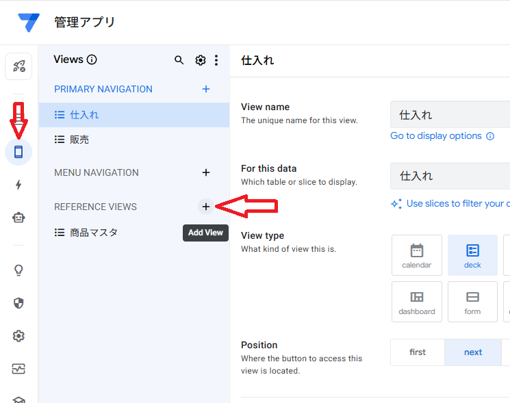 左側のスマホのアイコンをクリックするとViews画面に切り替わります。そうしたらReference Viewsの右+から新しいモノを作っていきます。