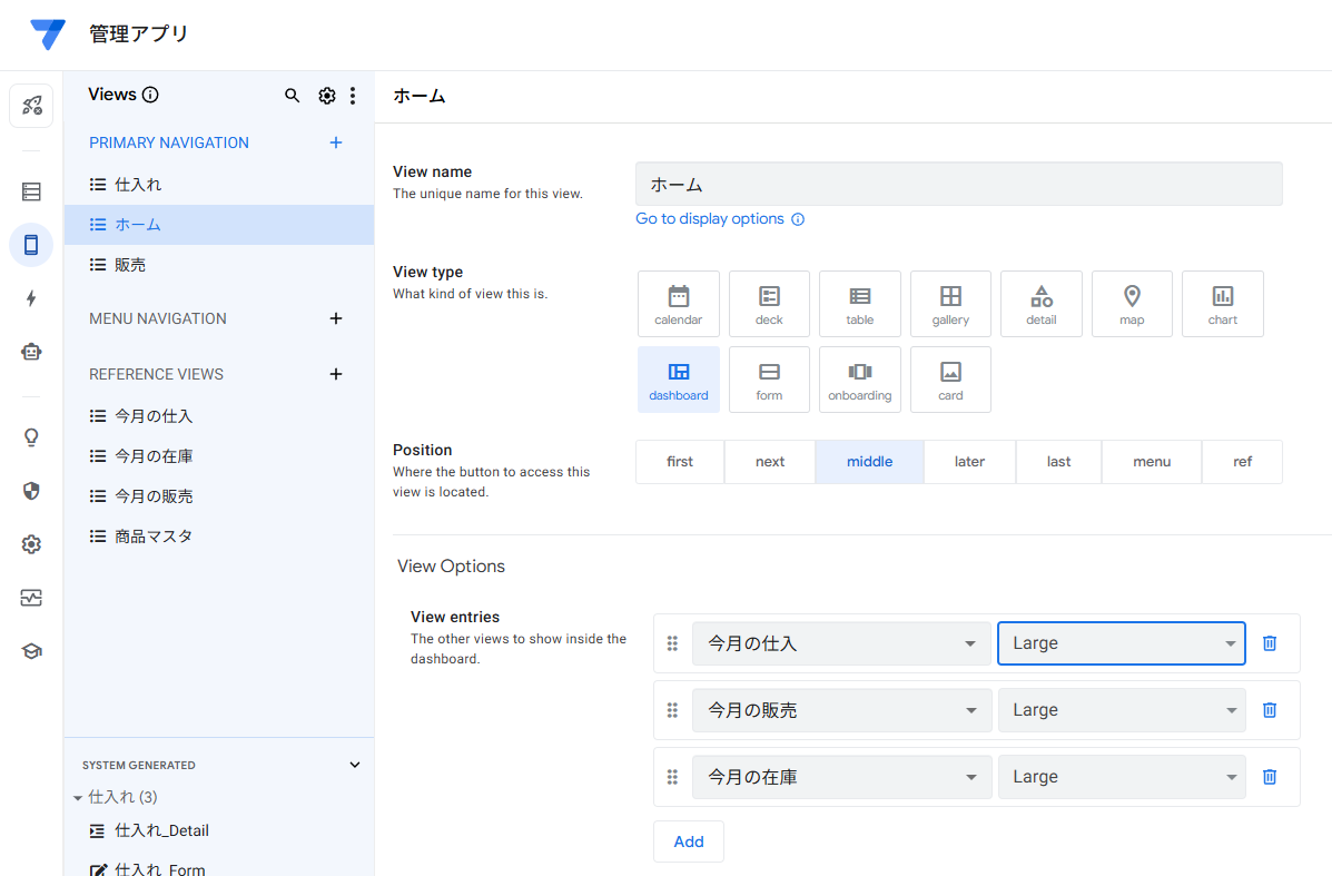 View OptionsのView entriesに「今月の仕入」「今月の販売」「今月の在庫」を追加します。